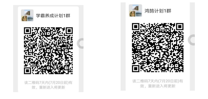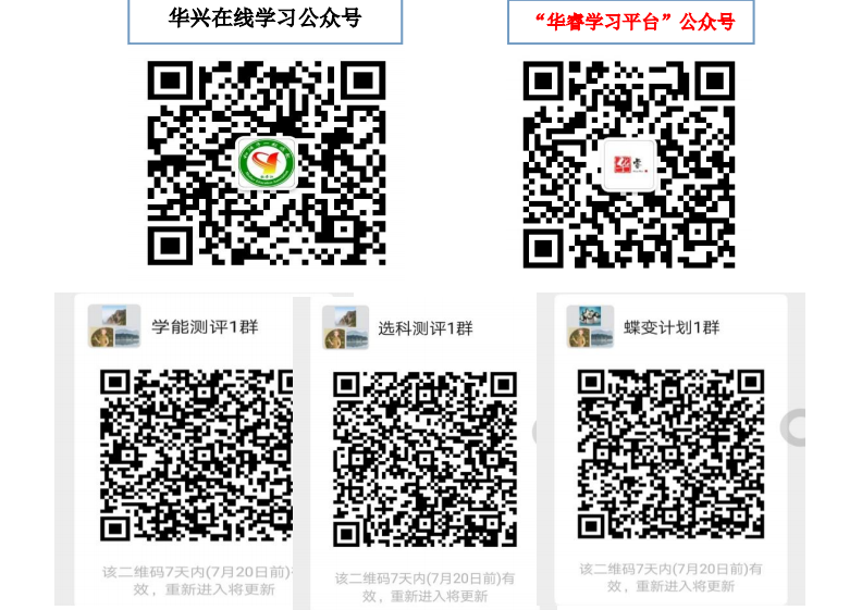 三是加入群组,报名交费。凡想了解“学习力提升暑期集训营”的老师、家长和学生需关注“华睿学习平台”(重点关注)、“华兴在线学习”公众号。凡想参加“学习力提升暑期集训营”的学生需通过“华睿学习平台公众号”或者 www.hrwljy.com 网站报名交费,并扫描下面相对应学习群二维码加入相应群。
